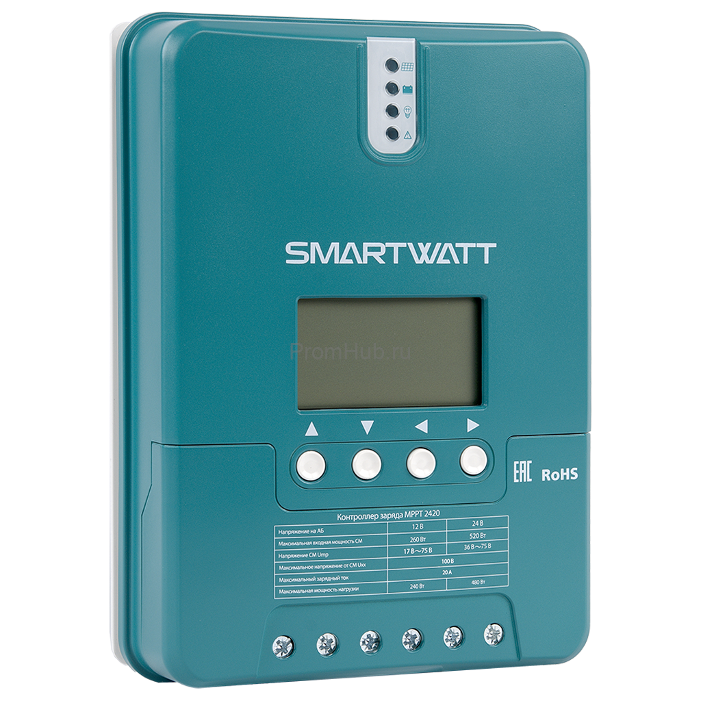 Контроллеры заряда SMARTWATT MPPT применяются для заряда аккумуляторных батарей от солнечной энергии в автономных электростанциях постоянного тока. MPPT контроллеры обеспечивают на 15-20% больший КПД заряда в сравнении с PWM контроллерами. Таких результатов удалось достичь за счет поиска точки максимальной мощности (Max Power Point Tracking) солнечных панелей. Для корректной работы контроллеров SMARTWATT МРРТ необходимо, чтобы напряжение на солнечных модулях было выше напряжения на аккумуляторной сборке. Итог: максимальный КПД преобразования энергии, что гарантирует наибольшую эффективность работы оборудования.