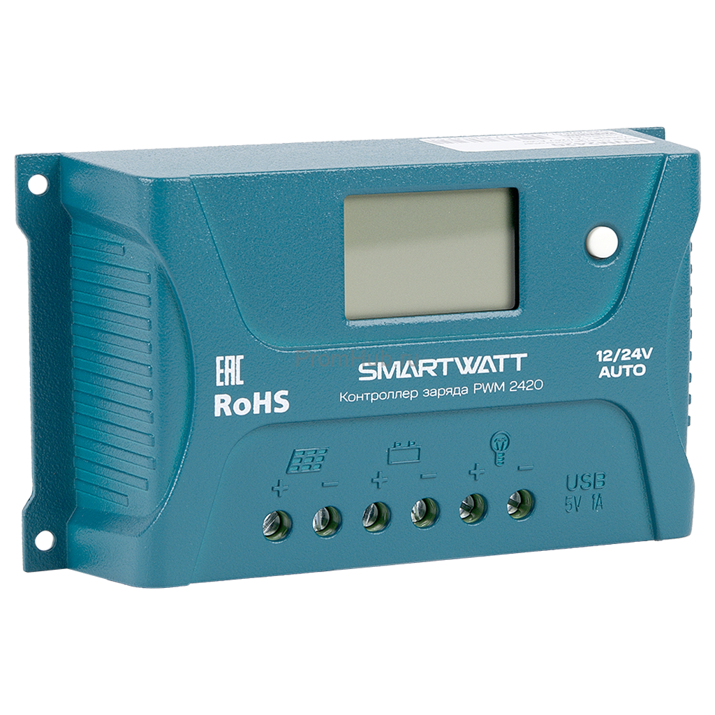 ШИМ-контроллеры заряда SMARTWATT PWM применяются для заряда аккумуляторных батарей от солнечной энергии в автономных электростанциях постоянного тока. PWM контроллеры работают по принципу широтно-импульсной модуляции (ШИМ). Этот метод подразумевает прямое соединение между солнечной панелью и аккумулятором. Напряжение модуля снижается до напряжения аккумуляторной батареи, вследствие чего происходит потеря мощности, которая может достигать 30% относительно максимально возможной. Пониженный КПД компенсируется невысокой стоимостью технологии. Важная особенность ШИМ-контроллеров SMARTWATT PWM — необходимость соблюдения номинальных напряжений солнечных панелей и аккумуляторной сборки.