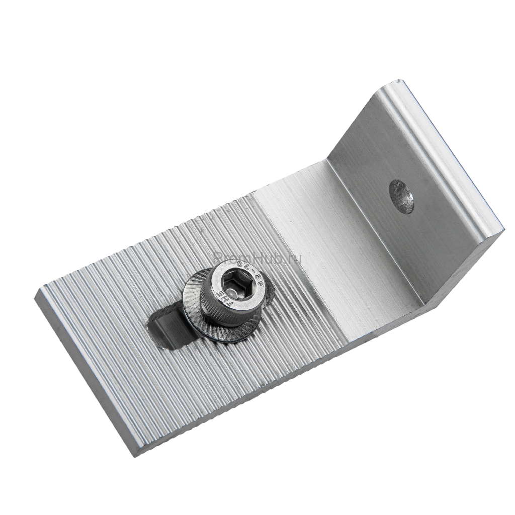 Универсальное L-образное крепление для установки монтажного профиля на кровлю. Изготовлено из анодированного алюминиевого сплава Al 6005-T5. В комплект поставки входят кровельный саморез и уплотнительная пластина из EPDM.